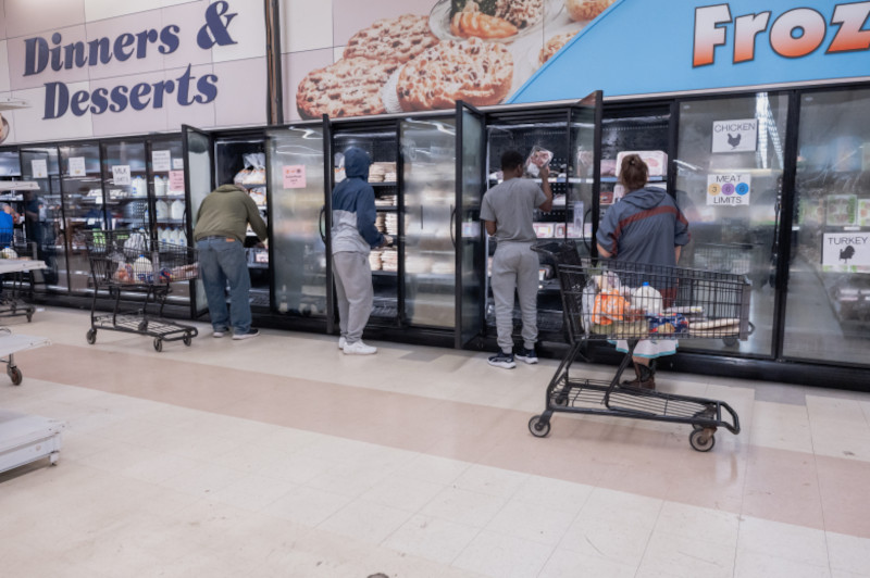 Visitors to the Oshkosh Area Community Pantry in Oshkosh, Wis., gather frozen items on May 9, 2024. The Emergency Food Assistance Program, funded by the federal government, provides participating food banks with essentials like milk, eggs, meat, and fresh fruits and vegetables. (Shane Fitzsimmons for Wisconsin Watch)