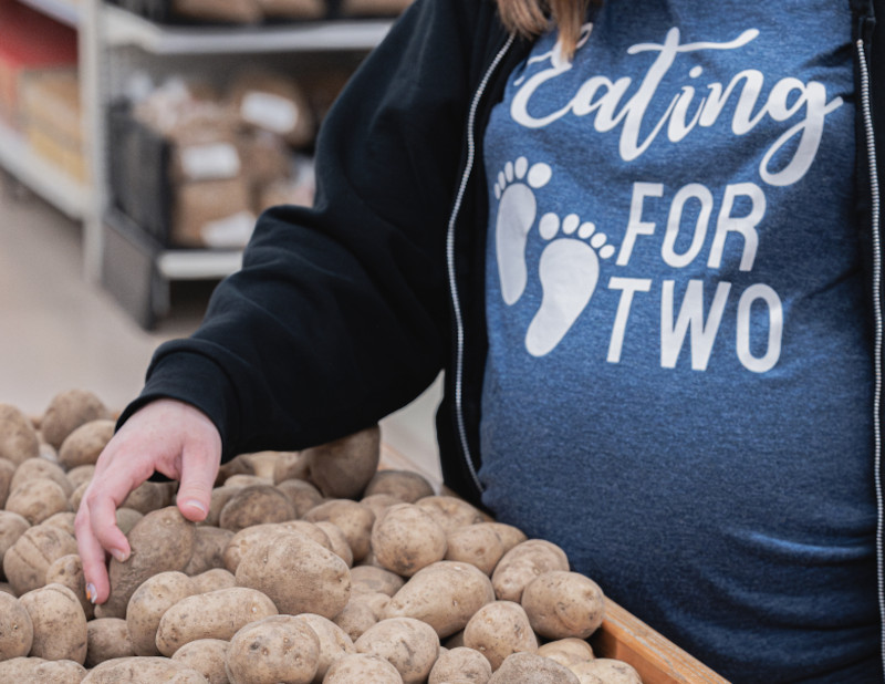 A woman wearing a shirt that says “Eating FOR TWO” grabs a potato in a bin full of potatoes. An expectant mother gathers potatoes at the Oshkosh Area Community Pantry in Oshkosh, Wis., on May 9, 2024. The Wisconsin Department of Health Services says eliminating identification checks and address verification at Wisconsin’s emergency food pantries will broaden access to food during high demand. Some pantry leaders worry about unintended consequences. (Shane Fitzsimmons for Wisconsin Watch)